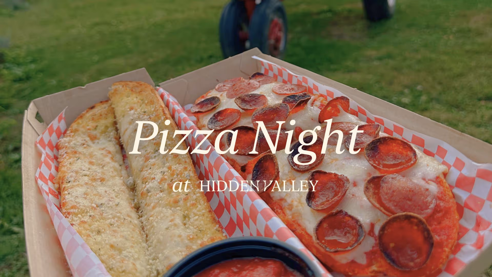 Head to Hidden Valley Orchards this Thursday for Pizza Night! Enjoy fresh French Bread Pizza, sip drinks, savor warm cider donuts, and explore the Activity Yard — all with cozy farm-fresh vibes.