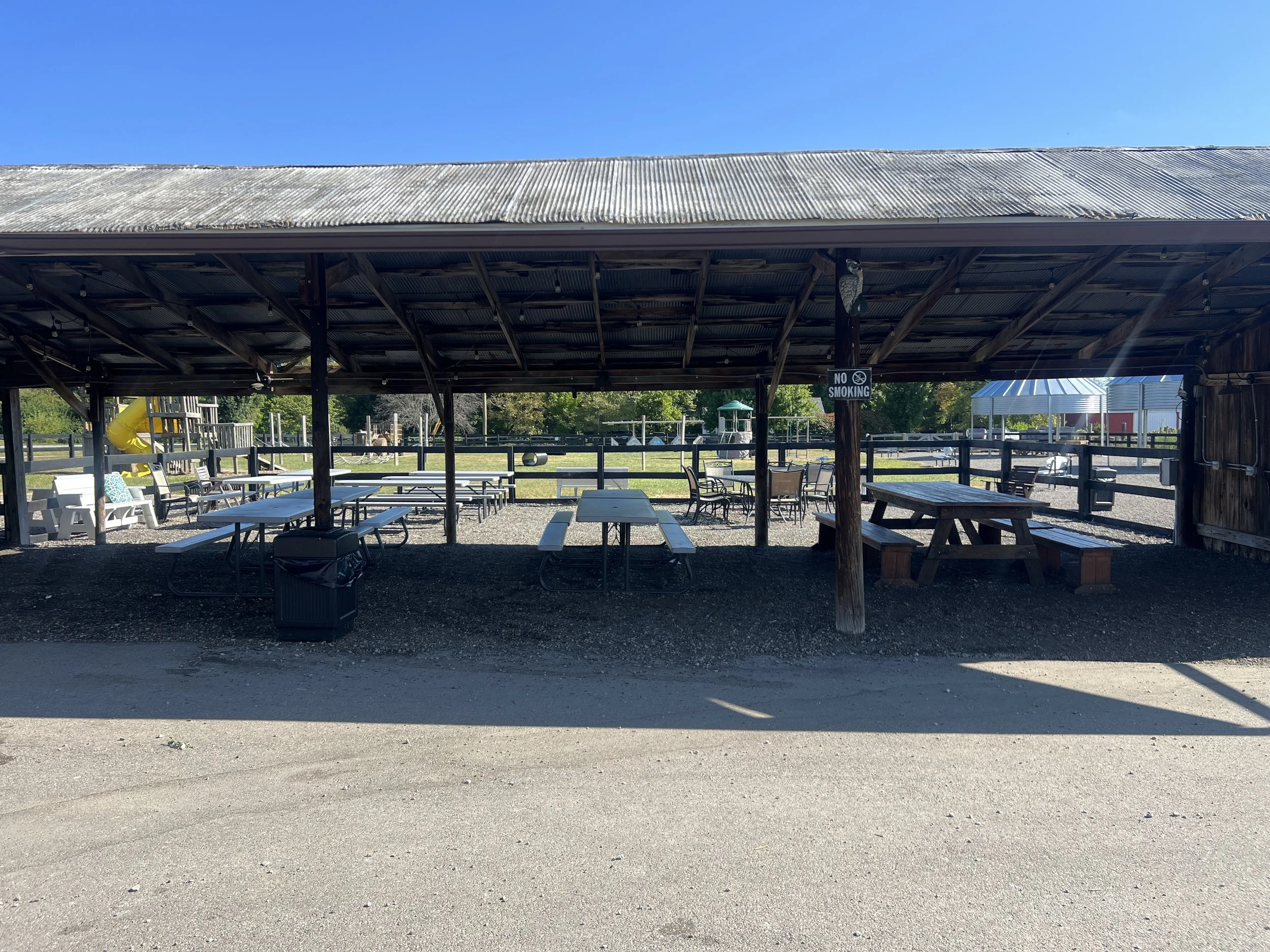 Our Main Street Pavilion is a covered outdoor pavilion with picnic tables great for group sizes of about 50 people. The Pavilion is located along Main Street, near the music stage and Crate Room, and runs parallel to the children's free-play area.