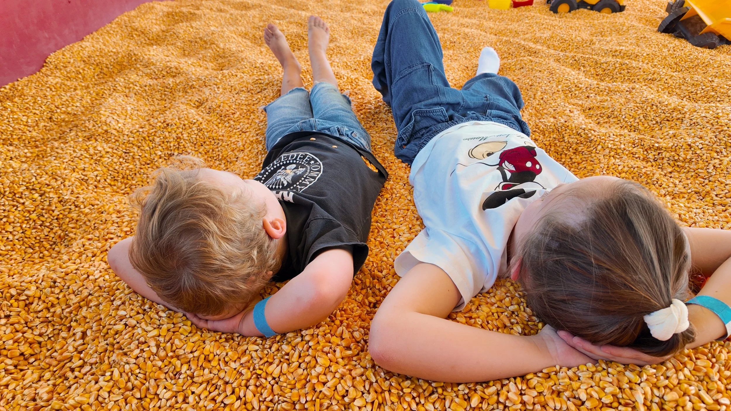 Dive into a giant bin filled with dried corn kernels — like a sandbox, but farm-style.